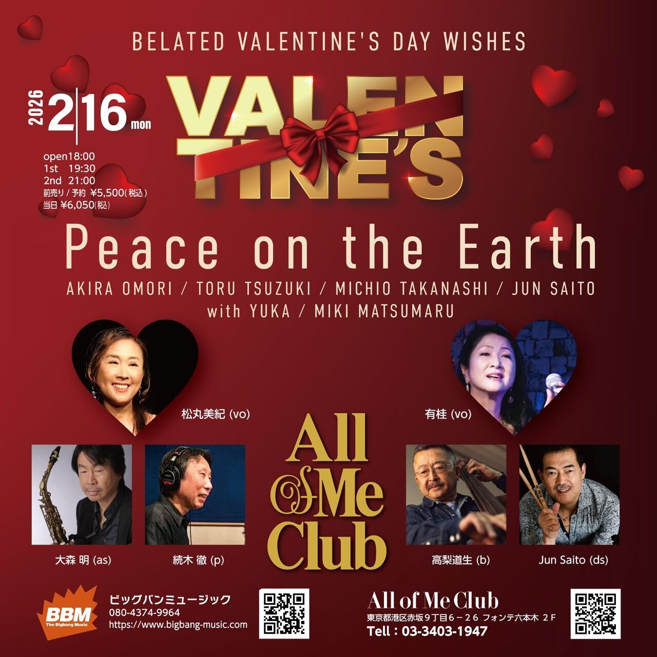 バレンタインの余韻を楽しむ、大人のためのジャズライブ。ボーカルに有桂と松丸美紀を迎えて贈る、愛と平和に満ちた一夜。遅れて届いたバレンタインの贈り物を、六本木All of Me Clubでお届けします。