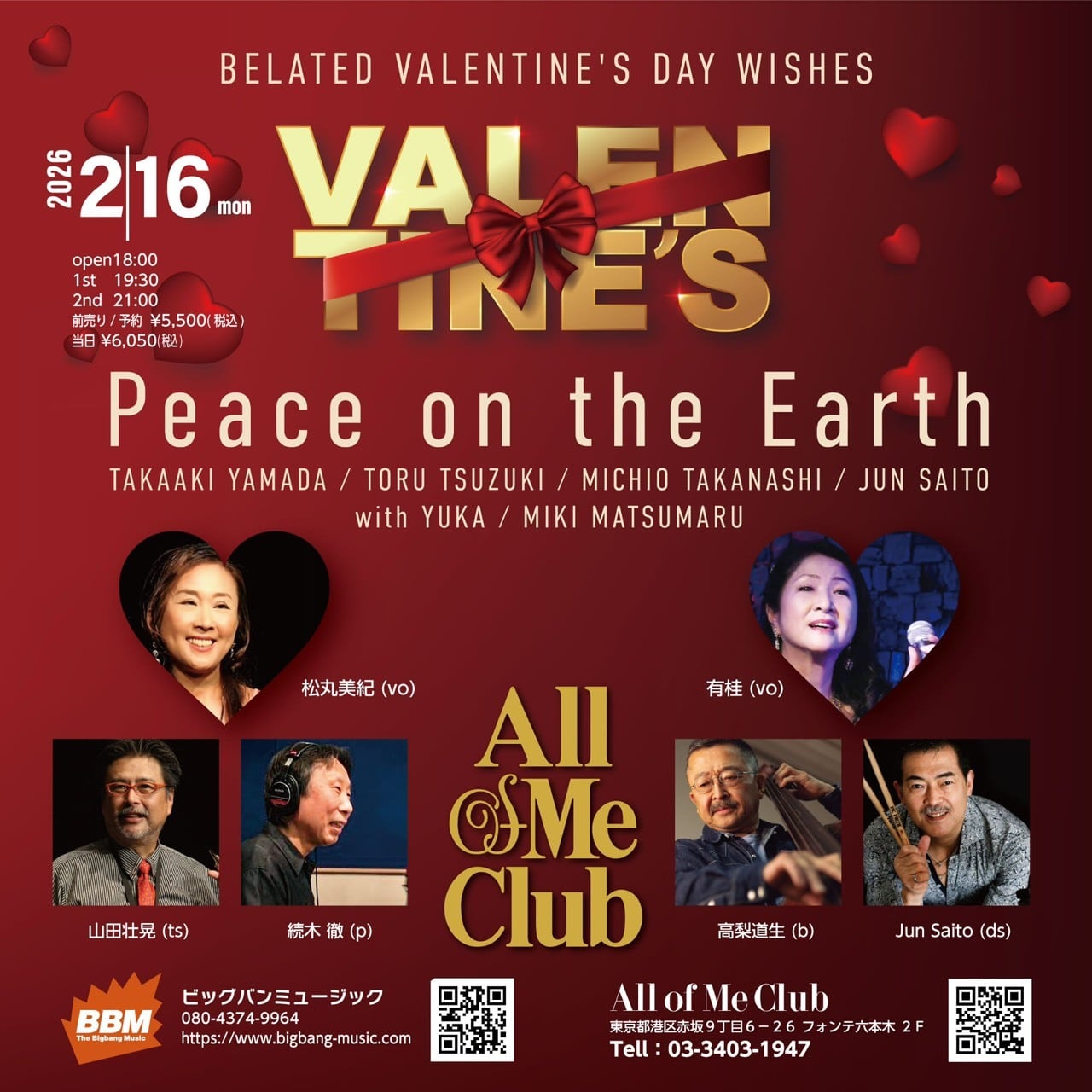 【チケット】[BELATED VALENTINE'S DAY WISHES]「Peace on the Earth」山田壮晃カルテット with 有桂 at All of Me Club | bigbangmusic